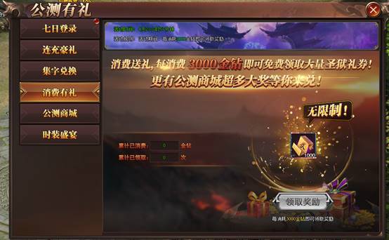 4. 消费有礼:活动期间,每消费3000金钻即可免费领取大量圣狱礼券,使用礼券可在公测商城兑换大奖。