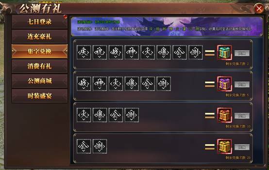 3. 集字兑换:活动期间,击杀野外怪物均有机会获得“庆”、”祝”、”战”、”神”、”火”、”爆”、”公”、”测”字帖,收集字帖可在活动界面兑换好礼。