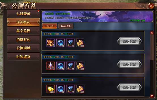 2. 连充豪礼:活动期间,每日充值20元/200元,累计充值天数达标达即可领取极品奖励。