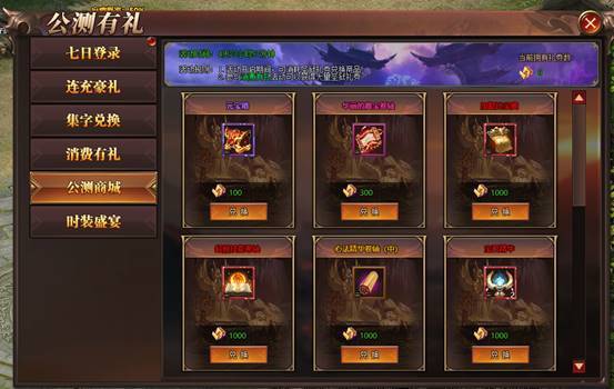 5. 公测商城:活动期间,参与消费有礼活动可获得大量圣狱礼券,使用礼券可在商城中兑换商城。