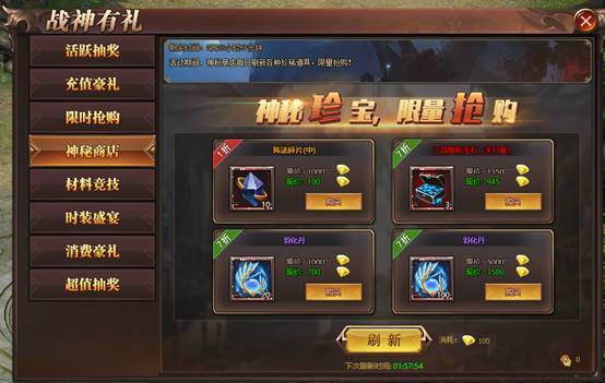 4. 神秘商店:活动期间,每2小时刷新各种珍稀折扣道具,可通过使用刷新令或金钻立即刷新。