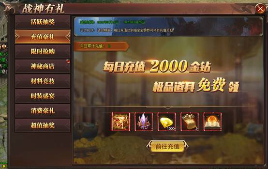 2. 充值豪礼:活动期间,每日充值达标达即可领取极品奖励。。