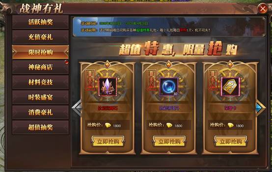3. 限时抢购:活动期间,每日刷新多种超值特惠礼包,每个礼包限购1次。