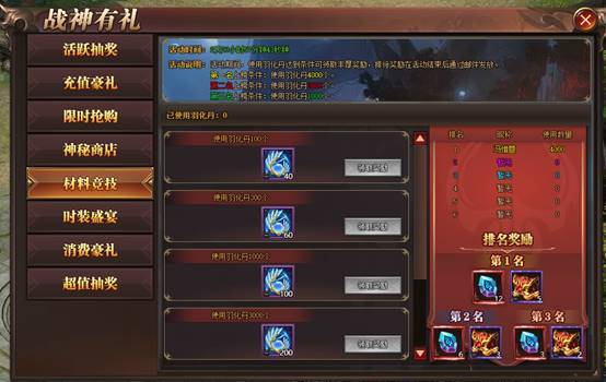 5. 材料竞技:活动期间,使用梵珠材料达到指定数值即可领取对应档位奖励,排名前三的玩家还有额外超值大奖。