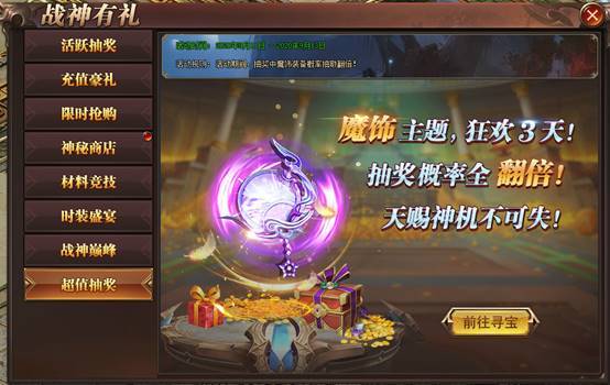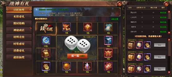 1. 活跃抽奖:活动期间内,完成任务即可获得活跃积分,消耗活跃积分可抽奖,并且当活跃积分达到指定数值时还可额外领取超值大奖。